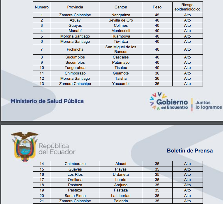 21 de los 221 cantones del Ecuador permanecen con semáforo en rojo, según datos que compartió el Ministerio de Salud, este miércoles 2 de febrero de 2022. La tabla actualizada refleja los municipios donde la situación epidemiológica aún es de consideración alta.